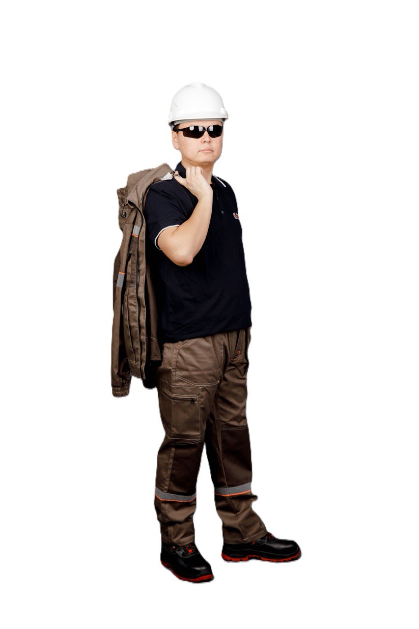 Брюки с притачным поясом, с застёжкой гульфика на молнию. В области боковых швов вставлена резинка для регулировки объёма. Брюки с задмини накладными карманами, наполенниками.